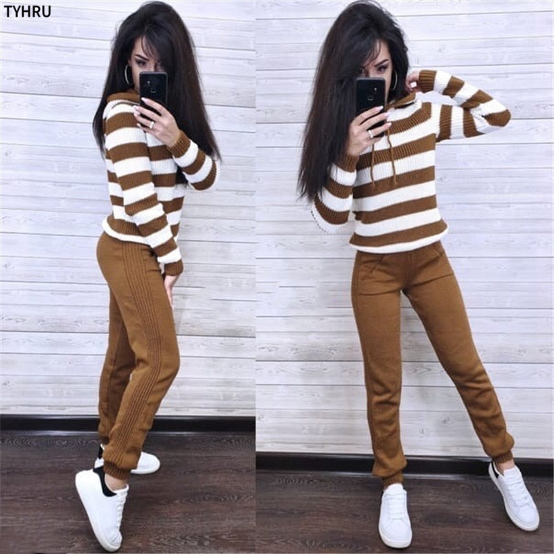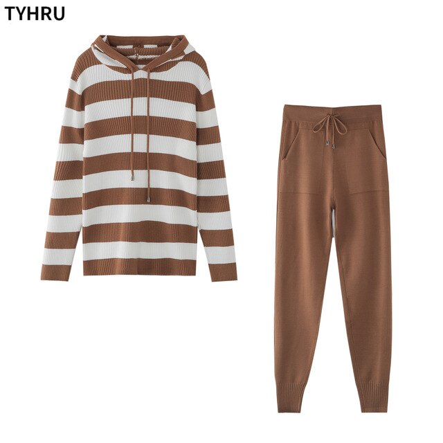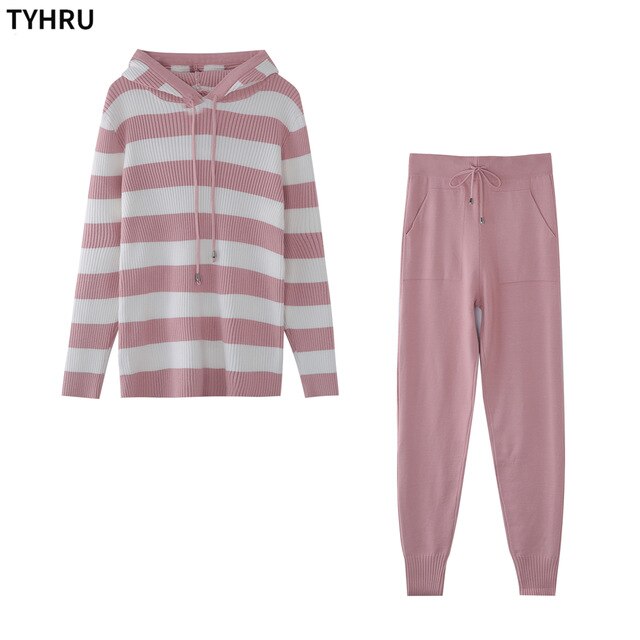 TYHRU Women's knitting suit Contrast color Hooded jumper pullovers+pant two piece women's knitted tracksuit